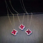 The design of the pendant is inspired by the delicate beauty of clover leaves, symbolizing luck, prosperity, and good fortune. Four intricately crafted clover motifs embrace the central ruby, creating a harmonious blend of nature-inspired elegance and modern sophistication.