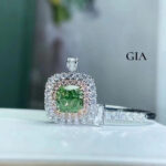 At the heart of this exceptional ring lies a 1.20-carat fancy green diamond, cut in a cushion modified brilliant style. Green diamonds are exceedingly rare and symbolize life, renewal, and prosperity. This diamond’s fancy green color is both vibrant and enchanting, making it a standout piece. The cushion modified brilliant cut enhances the stone’s brilliance and fire, blending the classic cushion shape with additional facets for maximum sparkle and light reflection.