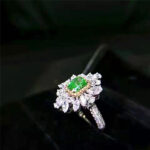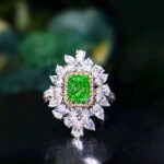 At the heart of this captivating ring lies a mesmerizing GIA-certified SI1 1-carat natural fancy green diamond, radiating a luscious hue reminiscent of lush emerald forests and pristine meadows. The diamond’s exceptional clarity and vibrant coloration elevate it to a realm of unparalleled beauty, making it a coveted centerpiece for any engagement ring.