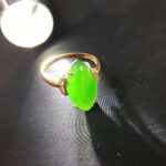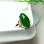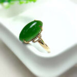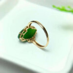 The ring’s setting in 18k gold adds a layer of luxury and durability. Comprising 75% pure gold, 18k gold is known for its rich, warm hue and strength. This makes it an ideal choice for jewelry, ensuring that the ring not only looks stunning but also withstands the test of time. The gold setting enhances the vivid green of the jade and the sparkle of the diamonds, creating a cohesive and elegant look.